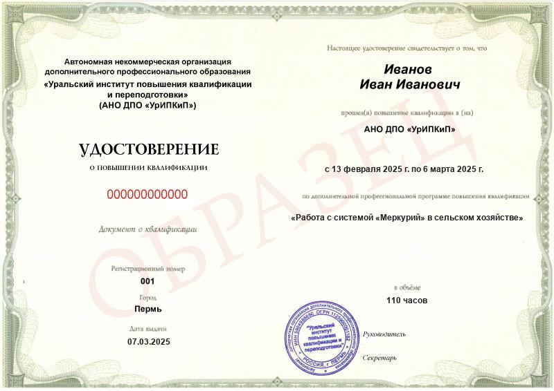 Удостоверение о повышении квалификации Подтверждает ваше обучение по программе «Работа с системой «Меркурий» в сельском хозяйстве».