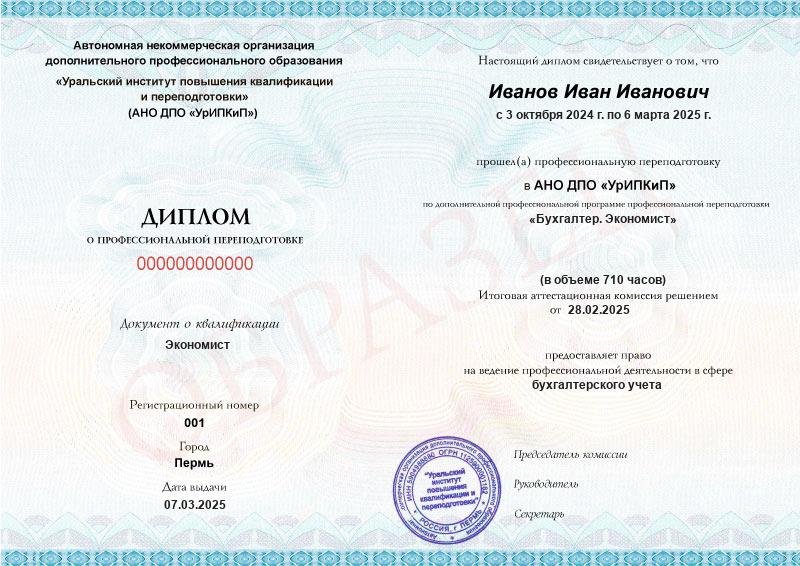 На курсе вы получите диплом о профессиональной переподготовке с присвоением сразу двух квалификаций: бухгалтер и экономист.