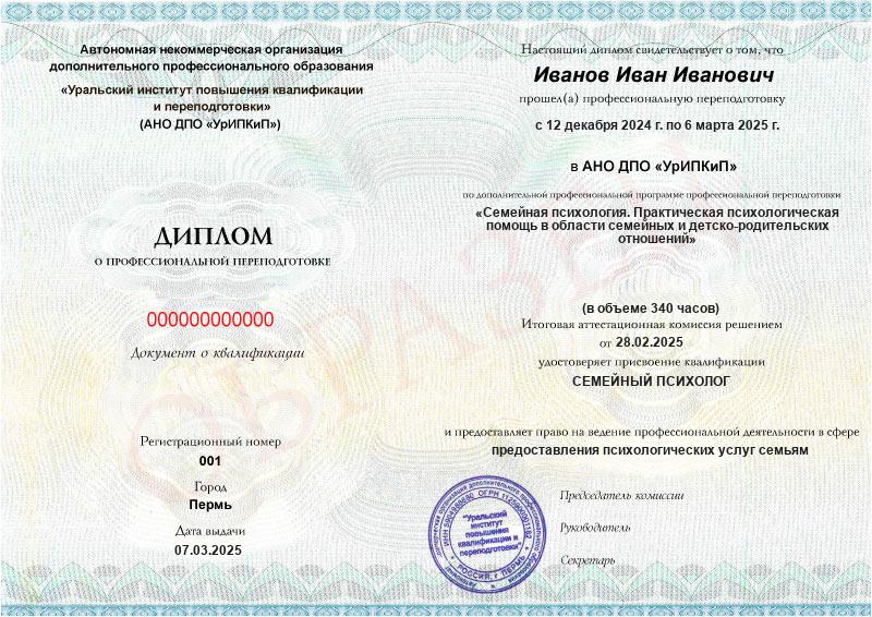 Дворецкая Ирина Юрьевна. Проходила обучение по специальности «Семейная психология. Практическая психологическая помощь в области семейных и детско-родительских отношений». Продолжительность обучения с 03.09.24 по 30.11.24. О данном институте узнала в сети Интернет. Искала подходящий для себя курс дистанционного обучения для повышения квалификации и переподготовки. Рассматривала много вузов по всей России. Прочитав программу выбранного курса, предложенную данным вузом, решила, что мне это интересно. Обучение в Уральском институте повышения квалификации и переподготовки мне понравилось. Полностью удовлетворена реализацией своего запроса в области повышения квалификации. Получила достаточно много информации и инструментария для работы психолога. Всегда получала необходимую помощь и качественные рецензии на свои практические работы от педагогов. Интересные вебинары, практико-ориентированные с жизненными примерами были очень полезны. Оценила преимущества дистанционного образования. Обучалась в свободном режиме не смотря на разницу во времени, связанную с нахождением в часовых поясах. Можно было самой планировать расписание занятий. Своим коллегам рекомендую данный вуз для повышения квалификации и переподготовки. Возможно, в будущем воспользуюсь услугами данного вуза. Спасибо большое преподавателям, менеджерам, администраторам за качественное обучение, новый опыт. Желаю добра, счастья, успехов всем сотрудникам вуза! С уважением, Ирина Юрьевна